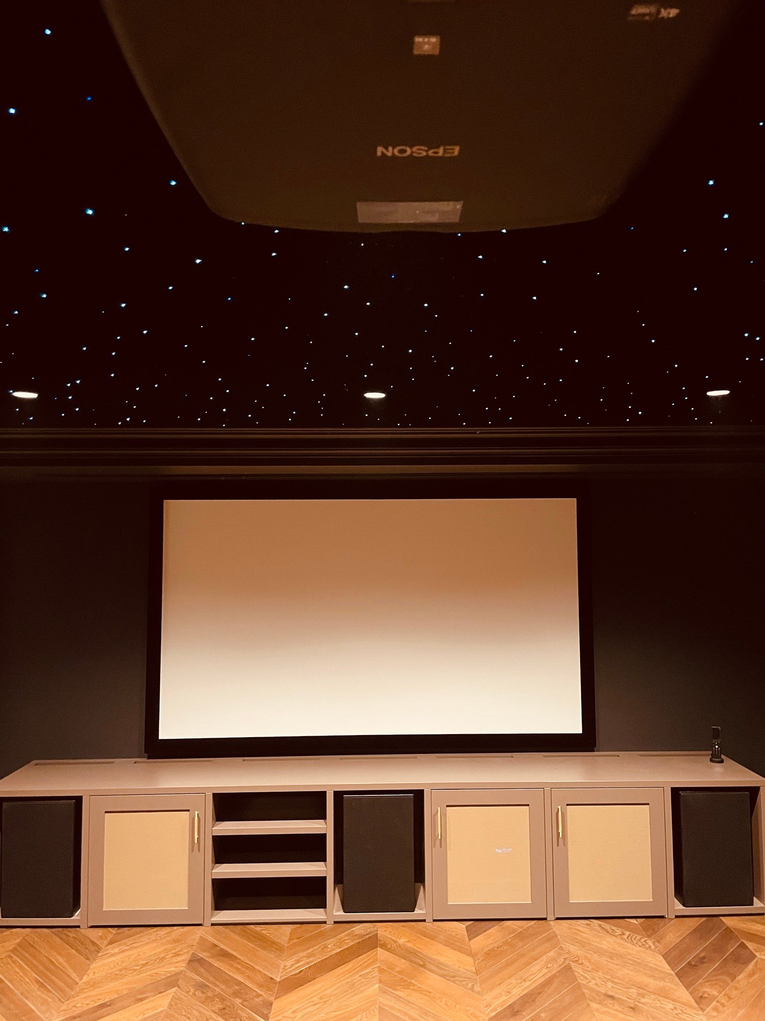 To elevate the overall atmosphere, a custom star ceiling was integrated into the room, adding a dramatic yet elegant touch that enhances immersion without distracting from the screen.